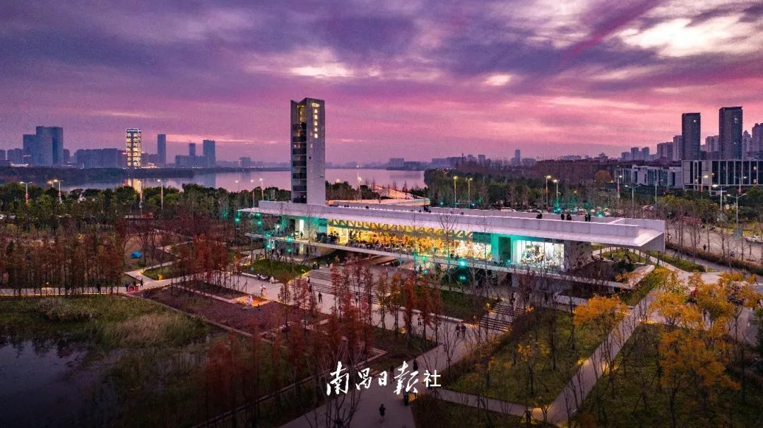 秋季傍晚进景区逛逛,感受一下落霞之美,江对岸是现代建筑双子塔,这边有飞檐楼阁,感受着赣江的晚风,恬静惬意。