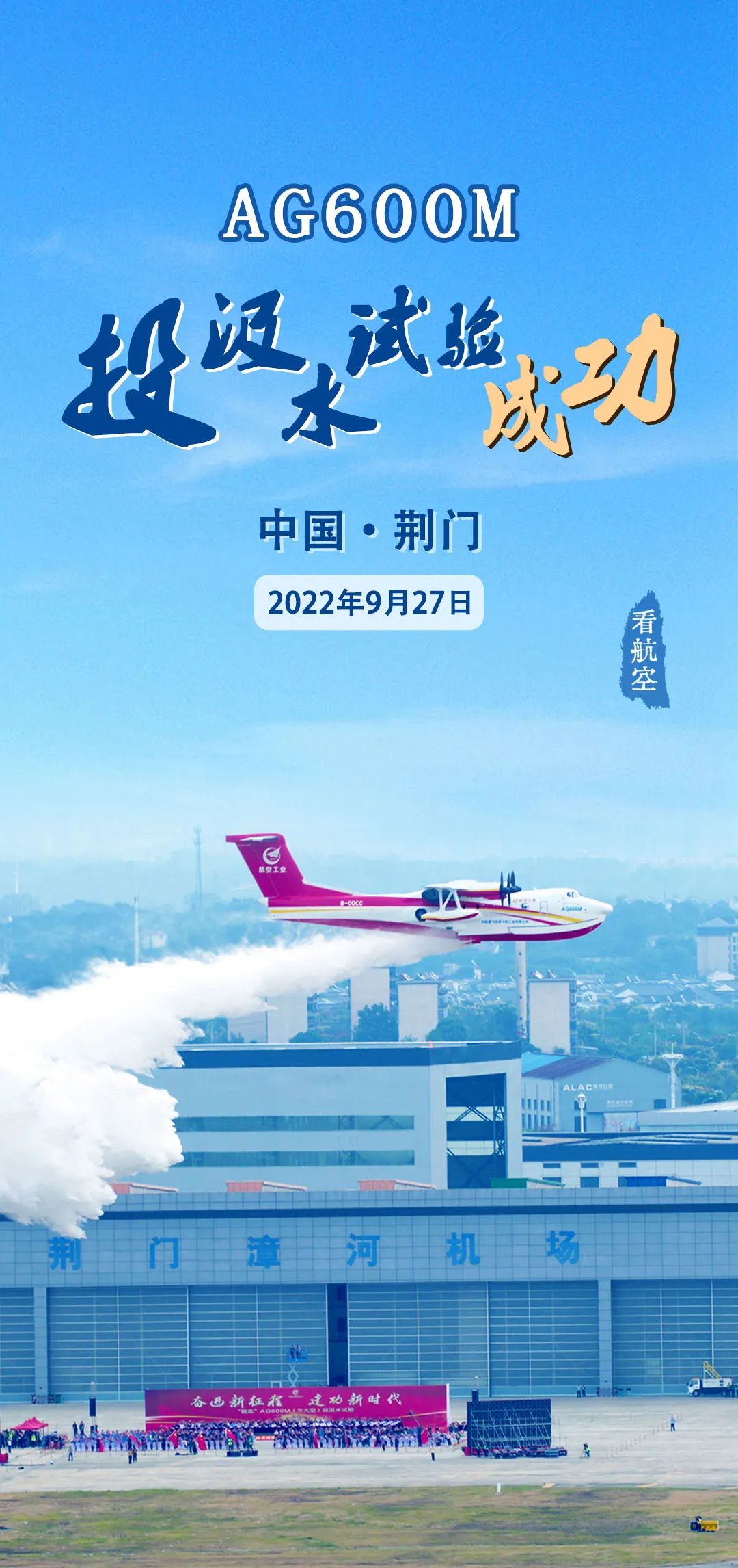 10时05分,由赵生、孙康宁、魏鹏和焦连跃组成的机组,驾驶满载12吨水的AG600M灭火机从漳河机场跑道陆上起飞,在投水区域完成投水后平稳降落在漳河水库,在水面高速滑行并完成12吨汲水,随即腾空而起,在空中完成一系列既定试飞科目后,在投水区域再次投水,精准覆盖目标区域,并于10时16分顺利降落漳河水库。整个试验过程飞机状态良好,各系统运行稳定,投水精准度及投水量满足设计目标,圆满完成了“地面注水投水-水面汲水投水”连贯作业模式验证。