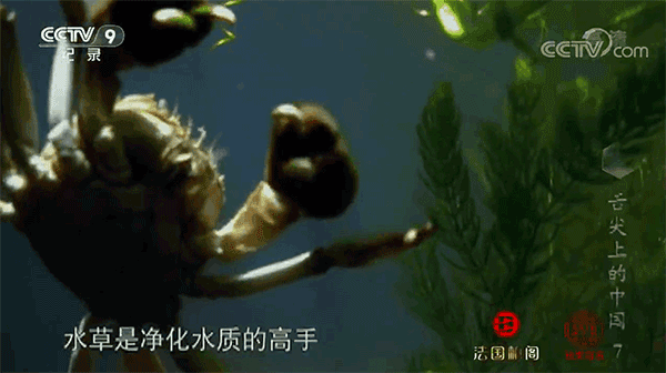 水草对螃蟹的健康至关重要 | 截自《舌尖上的中国1》除了环境,伙食也很重要,螃蟹的饲料得注意荤素搭配。