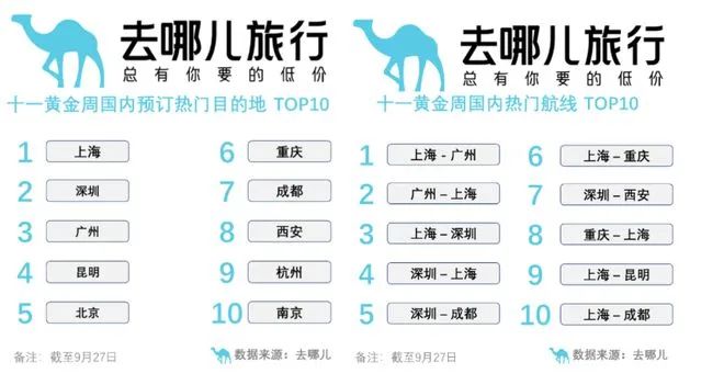 此外,根据航旅纵横预测,今年“十一”期间,国内航线预计出行人数超过320万,日均出行人数较中秋小长假上涨约15%。其中,“十一”期间热门目的地前十为上海、广州、北京、昆明、深圳、杭州、西安、南京、重庆、长沙。本期编辑 | 刘艳美