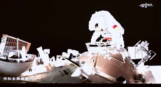 北京时间2021年11月7日,王亚平身着飞天服出舱。天和全景摄像机/摄183天后的团聚