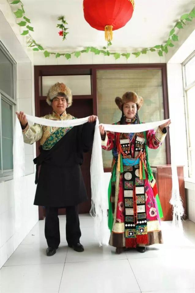 华锐藏族服饰华锐藏族在长期的生产生活中,形成了自己独特的服饰文化和审美观以及服饰制作技艺。华锐藏族服饰,一般有便装和节日装、男装和女装之分。夏天一般穿布制长袍或白褐衫,脚穿皮靴或便鞋,头戴礼帽或尖顶帽,女性多半戴黑布头巾;冬天穿白板皮袄和搭面皮袄,头戴狐皮帽、毡帽或“四片帽”,脚穿皮靴或皮棉鞋。华锐藏族服饰中衬衣是一个重要部分,一年四季不可缺少的服饰,颜色大都为白色。华锐藏族的衬衣通常有两个领子,一个为大领,一个为小领,通常会用好看的缎面和水獭皮包边,有较强的层次感,起到一定装饰效果。老年装一般在皮袄上用黑或蓝布做面,用白或蓝皮做领。在喜庆佳节时,穿用绸缎、毛料、氆氇等原料缝制的长袍,其大领、袖口、衣边镶有织锦、水獭皮、豹皮等装饰,系上五彩腰带,拖出右袖,显示出较强的华锐特色。