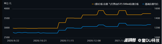 评价一款白酒是不是高端品牌,最直观的是产品价格与主打产品的保值能力。从同花顺的数据中可以看到,贵州茅台的代表产品53°飞天茅台始终处于一个较高的价格段位,其他高端产品走势也基本趋同(2020.9.22至2021.1.27)。