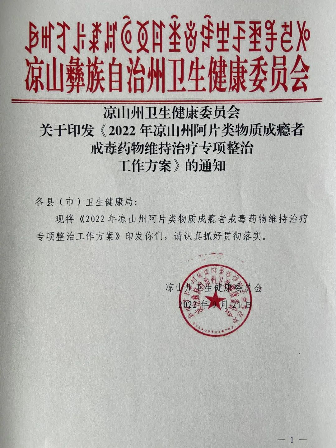 州卫健委针对州法院提出的司法建议,制定印发《凉山州卫生健康委员会关于进一步加强戒毒药物维持治疗管理工作的通知》《2022年凉山州阿片类物质成瘾者戒毒药物维持治疗专项整治工作方案》,从9月25日至10月20日在全州范围内开展一次美沙酮维持治疗专项整治活动,强化美沙酮维持治疗服务点管理,全面落实吸毒人员领服美沙酮“三个当面”(当面发放、当面服用、当面检查)要求,坚决杜绝美沙酮滥用、吸毒人员擅自将美沙酮带离服务点等事件的发生。