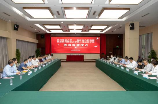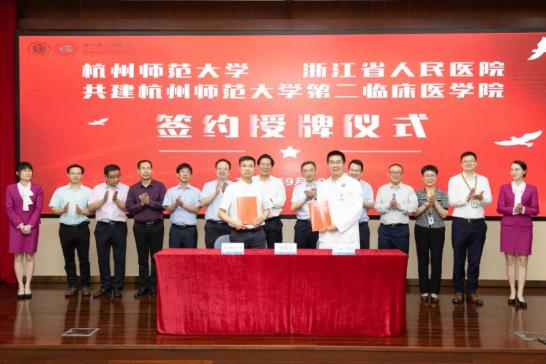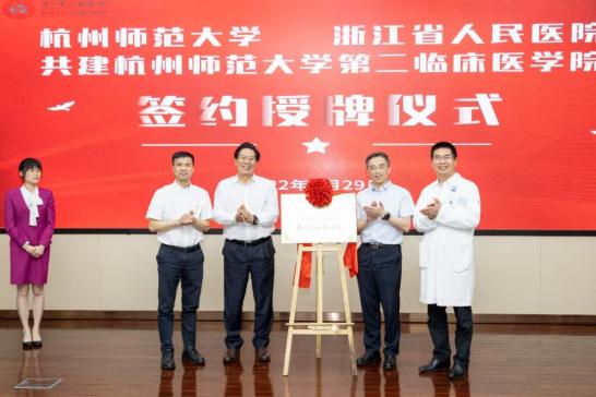 9月29日下午,我校与浙江省人民医院举行“杭州师范大学第二临床医学院”签约揭牌仪式。校长尚永丰院士、副校长黄兆信,浙江省人民医院党委书记洪朝阳、浙江省人民医院院长葛明华出席并共同为我校“第二临床医学院”揭牌。会上,尚永丰与洪朝阳分别致辞,黄兆信与葛明华共同签订《双方关于成立“第二临床医学院”的合作协议》。