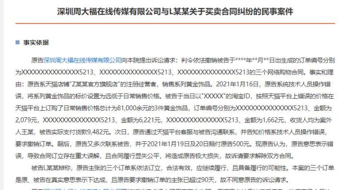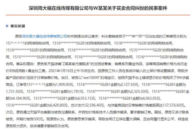 文书显示,2021年1月16日,深圳周大福公司系统技术人员操作错误,将网店系列黄金饰品的标价设置为远低于日常售价。