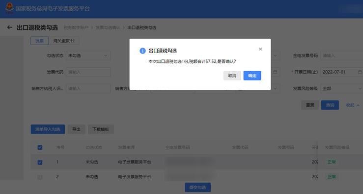 3.选中需要勾选的发票,点击“提交勾选”按钮,进行提示确认(如“本次出口退税勾选XX份,税额合计XX,是否确认?”)。确认无误后点击“确定”按钮,关闭窗口后提示提交成功。