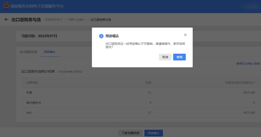 2.核对统计数据无误后,点击【用途确认】按钮,出现弹窗提示,点击【继续】按钮,完成用途确认。
