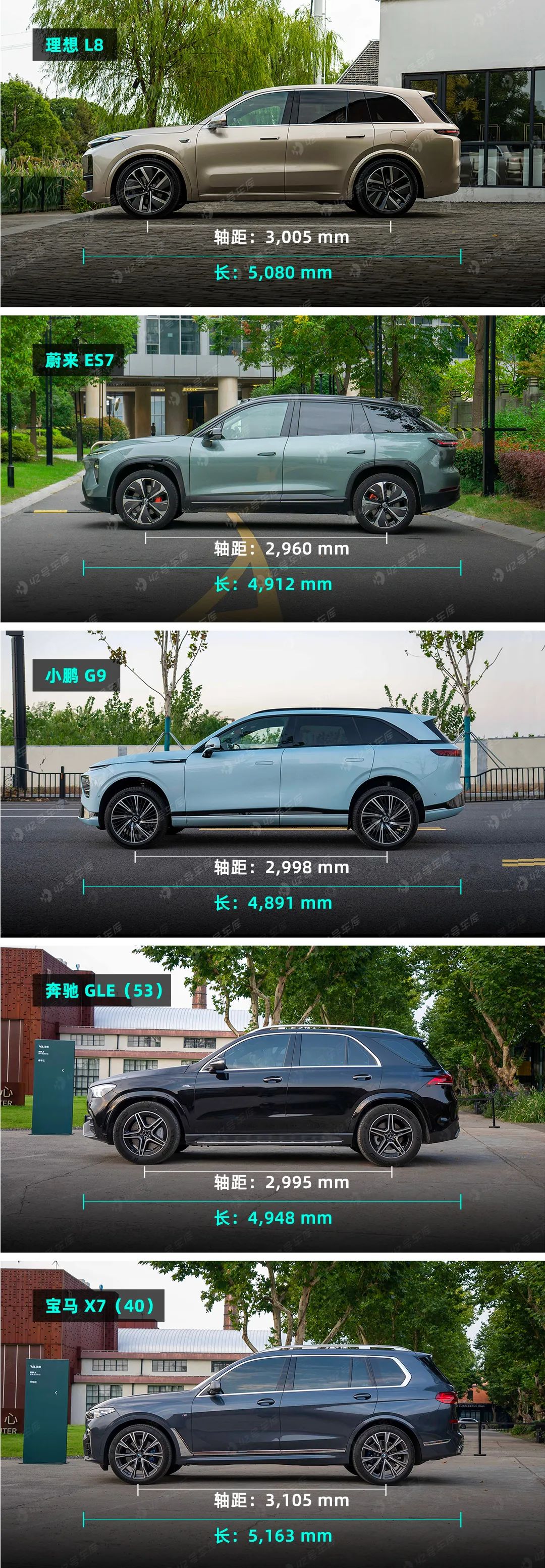 蔚来 ES7 一看就有一种运动健将的感觉,小鹏 G9 更多在于平滑的曲线,将空气悬挂降至最低之后,竟然有种休旅车的姿态。奔驰 GLE 传承了 ML 上非常标志性的的 C 柱设计,优雅不失力量;宝马 X7 的车身上有着大量平直的线条和棱角,线条从车头开始逐渐上扬,呈现出俯冲的姿态,这样的好处是不会显得 X7 像一台车长超 5 米 1 的全尺寸 SUV。轴距上,理想 L8 作为全场唯一一台 6 座的中大型 SUV,3,005 mm 的轴距坐拥全场最佳数值,较 ES7 多出 45 mm,不过与 G9 和 GLE 差距略小。想要赶上 3,105 mm 轴距的 X9,还是得把这个活儿交给大哥 L9。