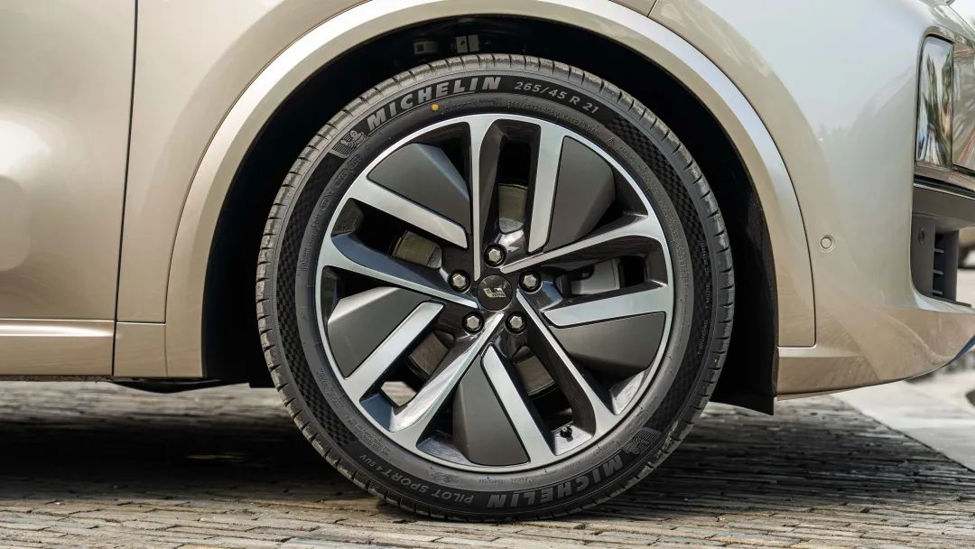 轮毂配置上,我们实拍的这台理想 L8 选配了 21 英寸的轮毂,也就是理想 L9 的同款,有银灰双色轮毂和黑灰双色轮毂两个配色可选。轮胎方面搭载的是 265/45 R21 的米其林 PS4 SUV 专用轮胎,轮胎价格在 2,500 元左右/条。