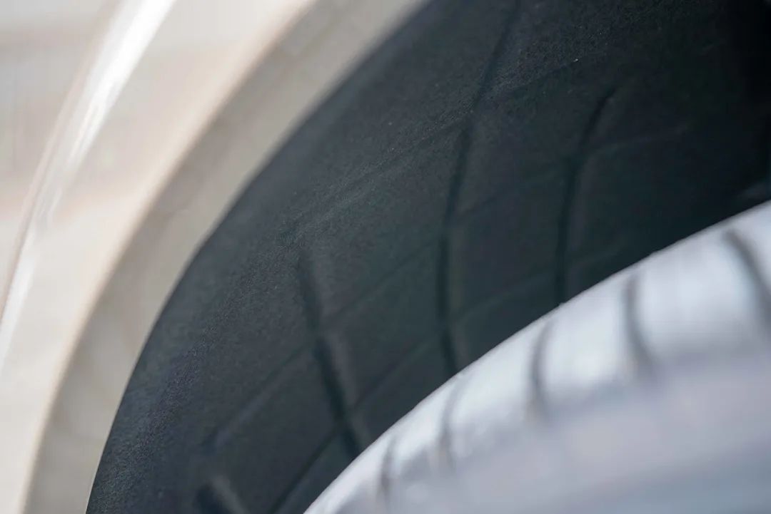 在拍摄轮毂的时候,我额外发现了理想 L8 的一个设计用心点,L8 的轮拱内侧不是我们一般所见到的树脂材质或是玻璃纤维材质,而是类似于植绒的内衬面料,并且在内部还额外设计了花纹。可以预期的是,这样的设计会让车辆的动态 NVH 有着非常大的提升。