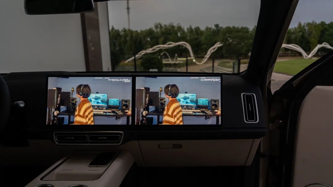 值得一提的是,理想 L8 上的中控屏、副驾屏以及后排娱乐屏均为 LCD 材质,相较理想 L9 的 OLED 有些许差异。抛开厚度问题,在显示纯黑画面时,能看见较为明显的黑色点亮背景。这样一来不仅在视觉观感上有所降低,还会凸显出屏幕的黑边。好在这块娱乐屏并不会像平板、手机一样捏在手中近距离观看,所以就二排的实际体验而言,还是值得肯定的。