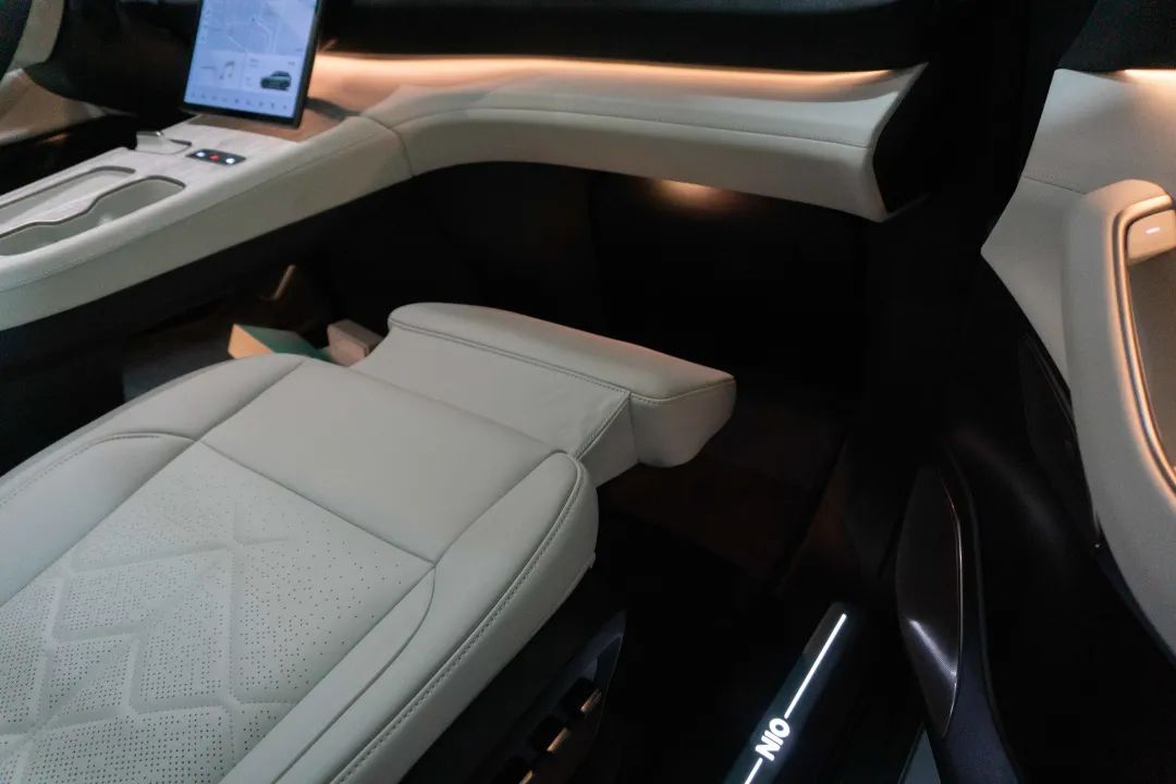 功能上支持通风、加热、按摩,这个按摩是正儿八经的 10 点按摩。不过前排座椅中,蔚来 ES7 的女王副驾最深得人心。有高铁一等座的味道了,除了能将大腿小腿都承托住之外,底部还有一个脚蹬,展开之后能获得一个非常舒展的坐姿。