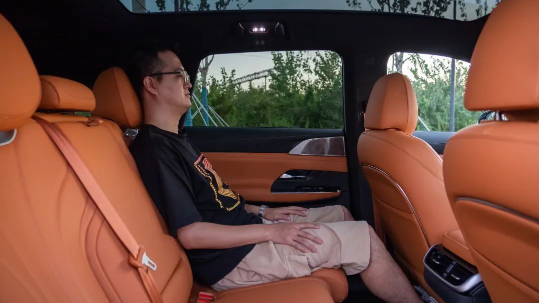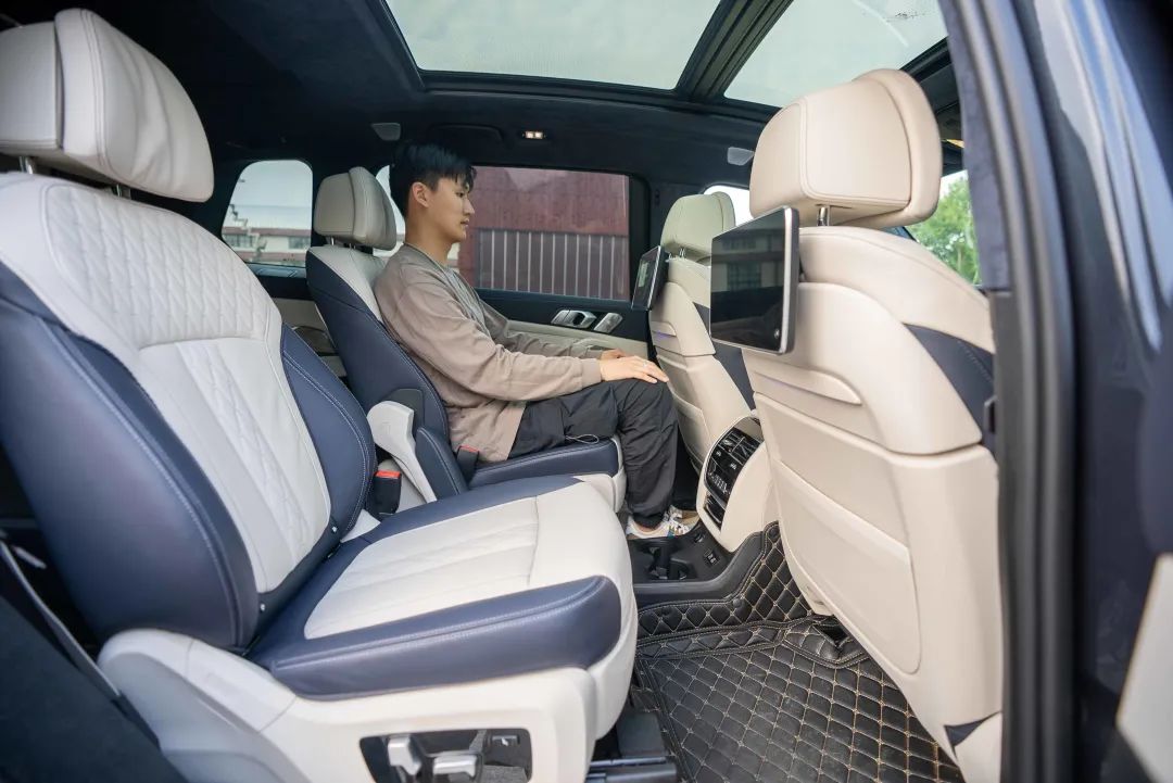 我们再来看尺寸更大的宝马 X7,在腿部空间仅有一拳的情况下,后排腿部空间还有 4 指,整体的空间较理想 L8 略大,但并没有大出太多,可以算作同一水准。