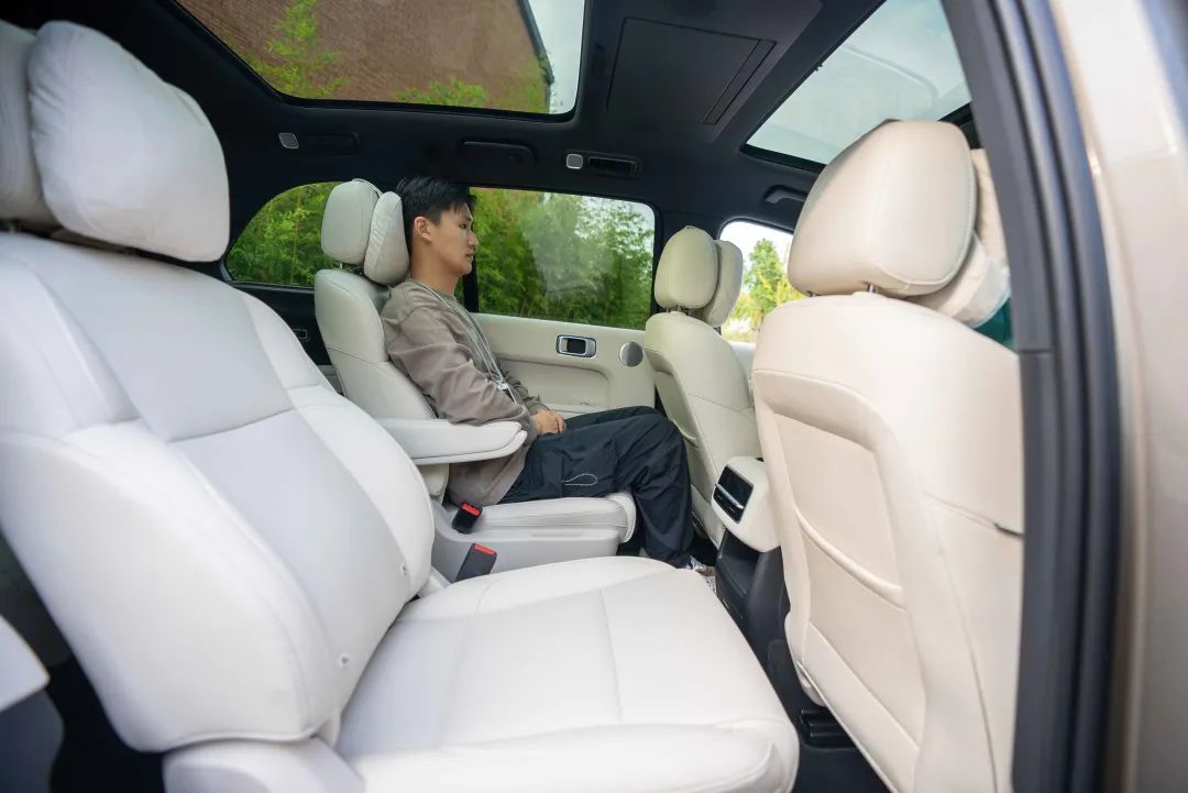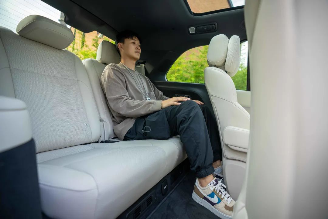 6 座车型中,为了同时让二排和三排都有一个较为舒适的空间保障,所以这两排都需要牺牲一下腿部空间。理想 L8 中,我在二排保证有 3 指的腿部空间情况下,后排能够达到一拳的腿部空间,算是一个大家都能够正常乘坐的空间舒适度。