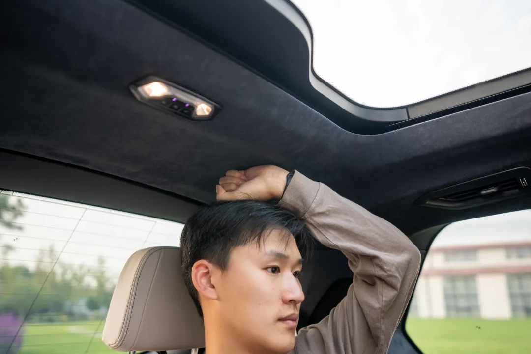 不过宝马 X7 的第三排头部空间稍好,我乘坐以后还有 1 拳的头部空间。外加第三排乘客也有天窗的配备,即便空间不如一二排这么大,但依旧不会感觉很压抑。