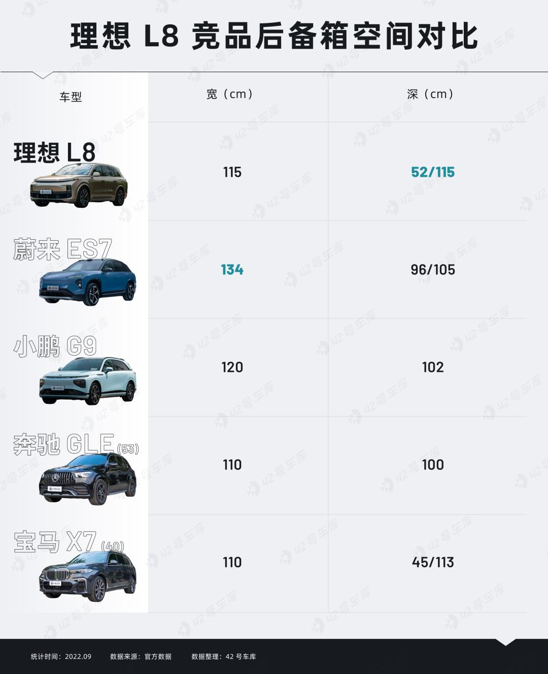 车身尺寸方面,L8 与 ONE 一样定位于中大型 SUV,长宽高分别为 5,080 x 1,995 x 1,800 mm,轴距 3,005 mm。放眼整个主流中大型 SUV 市场中,理想 L8 的车长和车高都算得上是大的,比蔚来 ES7 长 168 mm,比 G9 长 189 mm,较全尺寸的 X7 仅仅短了 83 mm。视觉效果和气场上,L8、G9 以及 ES7 看起来是更加具有未来感的,相较 GLE 以及 X7 会略失几分霸气,反倒有些呆萌。