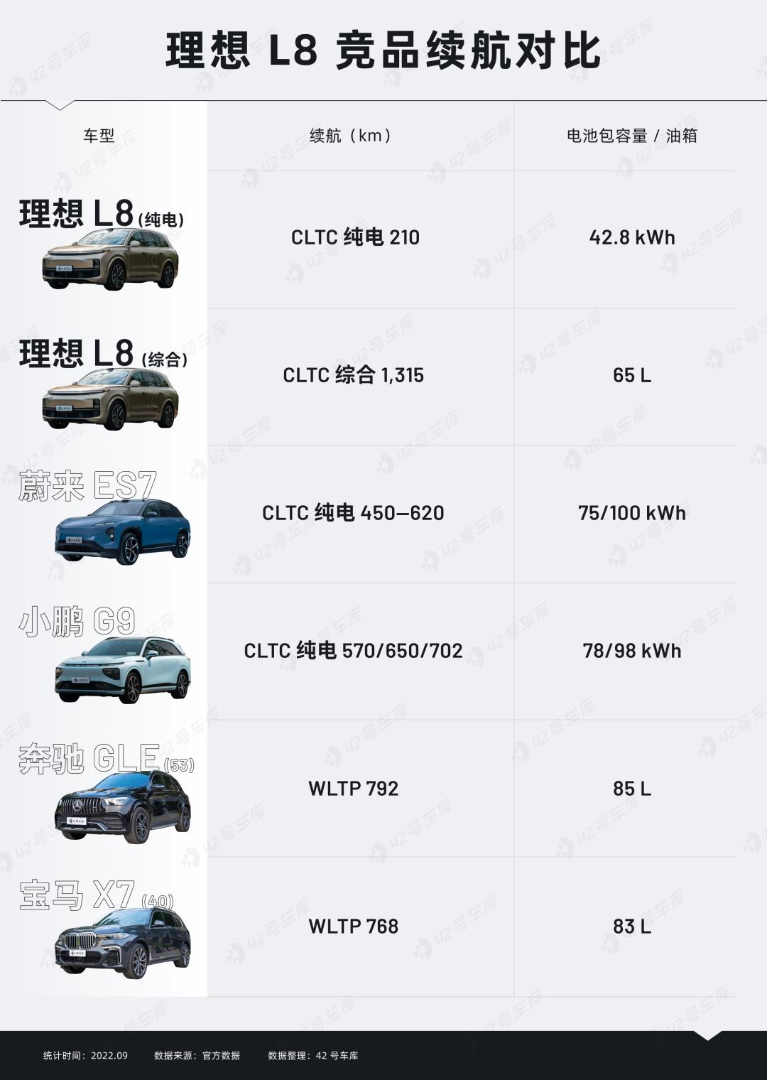 根据官方数据,理想 L8 搭载了一块 42.8 kWh 的 NCM 622 三元锂的电池包,最大 CLTC 续航为 210 km(WLTC 为 175 km),此外 1.5T 的四缸增程机配合上 65 L 的油箱,最大的 CLTC 综合续航为 1,315 km(WLTC 超 1,100 km),后续我们拿到理想 L8 实车之后也会第一时间给大家测一下,L8 的真实纯电续航以及真实能耗将会是多少。