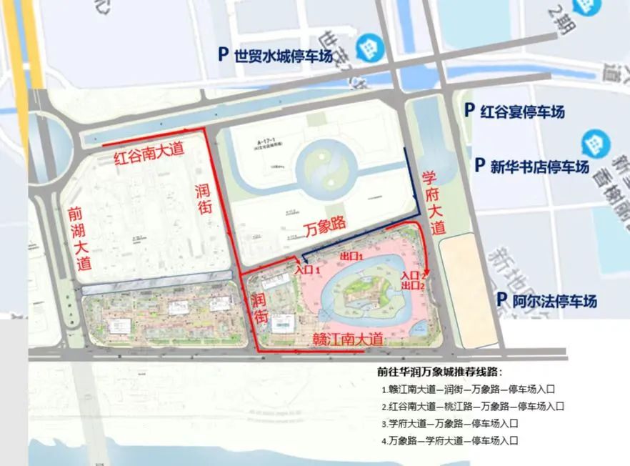 前往南昌之星摩天轮、万象城建议从学府大道、红谷南大道、万象路、赣江南大道等道路,进入周边停车场。