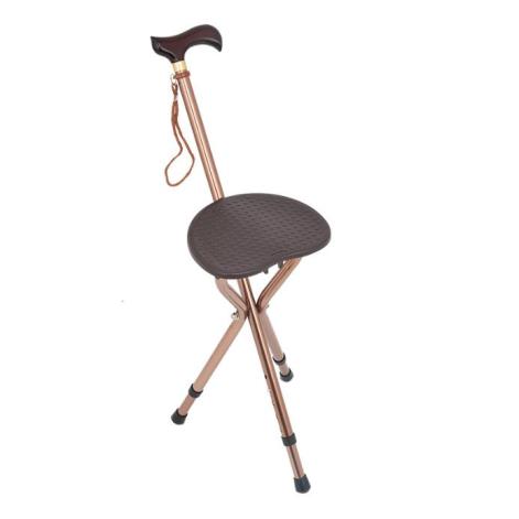 三脚带座手杖,行走时是单脚手杖,需要休息时可以撑开当座椅使用。但其重量较重,当座椅使用时稳定性差,一般情况下不建议老年人日常使用。