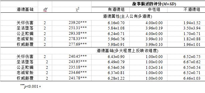 由于方差齐性检验显著,采用Kruskal-Wallis H检验,在道德属性和道德基础两个问题上,有道德、无道德和中性组的评分差异显著。评分结果如表2所示,说明实验材料对五个道德基础上三种道德属性的描述是准确、有效的。