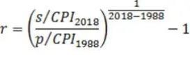 上面的公式中,S代表被试在2018年4月的估计价值,p代表物品在故事中的1988年时的价值,n是年代差(在本研究中n = 2018-1988 = 30),i代表着增长率。目标是将价值粗分转化为增长率。但是,这样转化并未考虑到实际物价的增长。为了将物价实际增长值考虑进来,本研究加入CPI(CPI 1988 = 118.80,CPI 2018年3月 = 641.96,以CPI 1978 = 100作为基准,CPI数据来源:中国国家统计局),产生一个调整后的r值代替i作为增长率的指标。即: