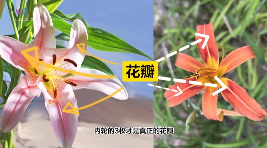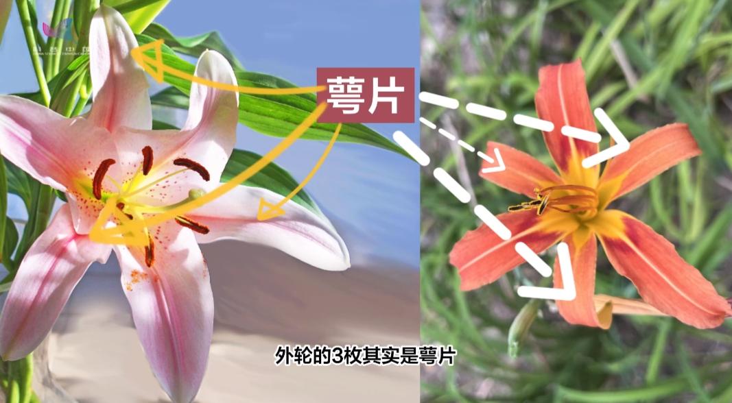 萱草和百合都有 6 枚花被片,分成两轮,注意啊,这叫花被片,不能叫花瓣,如果从解剖学上看,内轮的 3 枚才是真正的花瓣,外轮的 3 枚其实是萼片。