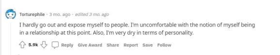 “我几乎不出门,也不把自己暴露在人前。如果我想到我将与一个人建立亲密关系,我就会感到不舒服。另外,我的性格较为冷漠,不习惯于过多展现自己的情绪。”