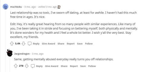 回复:“我也有类似的经历。上一段关系中我每天都被pua,这让我不敢再谈恋爱了。”
