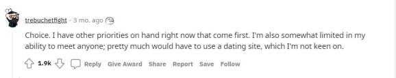 “我认为这与一个人的选择有关。我现在手头有其他事项需要我优先考虑。我认识新朋友的能力也十分有限,除非我使用约会网站,但我并不热衷于此。”