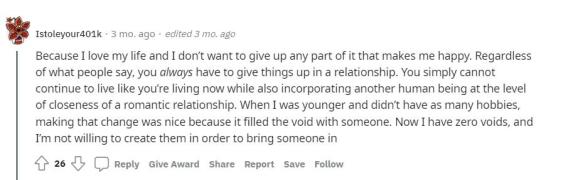 “因为我爱我现在的生活状态,我不想放弃其中任何让我快乐的部分。不管人们怎么说,在一段关系中你总是不得不放弃一些东西。你根本不可能继续过着现在的生活,同时还在恋爱里融入另一个人。当我年轻的时候,我没有那么多的爱好,因此我乐意做出这种改变。但现在我完全不会感到空虚,因此我不愿意为了某人而给自己制造空虚感。”