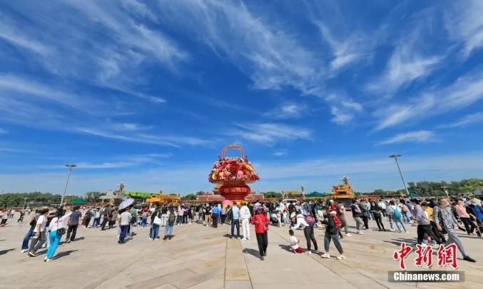 ▲“祝福祖国”巨型花果篮组装完成亮相北京天安门广场,吸引市民游客参观。中新社发 刘宪国 摄 图片来源:CNSphoto在做好防疫的同时,