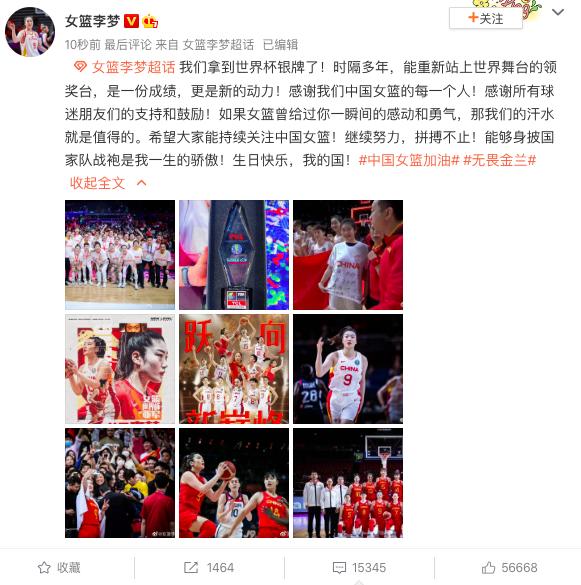 北京时间10月1日,中国女篮拿下世界杯亚军。因病缺席决赛的女篮球员李梦,赛后在新浪微博发文庆祝夺得银牌。