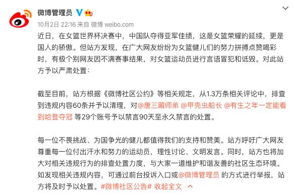 10月2日晚,@微博管理员 通报,根据《微博社区公约》等相关规定,对诋毁女篮运动员的29个违规账号予以禁言90天至永久禁言的处置。