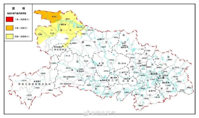 2022年10月4日10时—10月5日10时,预计神农架林区东北部、十堰(十堰市城区、郧阳大部、竹溪北部和中部、竹山北部和中部、房县北部和东部、丹江口)、襄阳(老河口西部、谷城北部和西部、保康西部局部)以及其他强降水区域发生崩塌、滑坡、泥石流的风险较大;十堰(郧西、郧阳西南局部)发生崩塌、滑坡、泥石流的风险大。