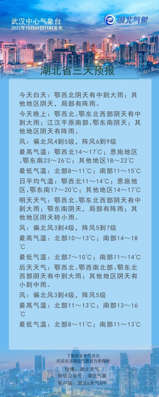此外,未来三天湖北阴雨天气维持,其中北部有中到大雨,南部阴天转小到中雨,阴雨更添凉意,提醒公众及时添衣保暖,以免着凉感冒。受降雨影响的山区需加强地质灾害防范。