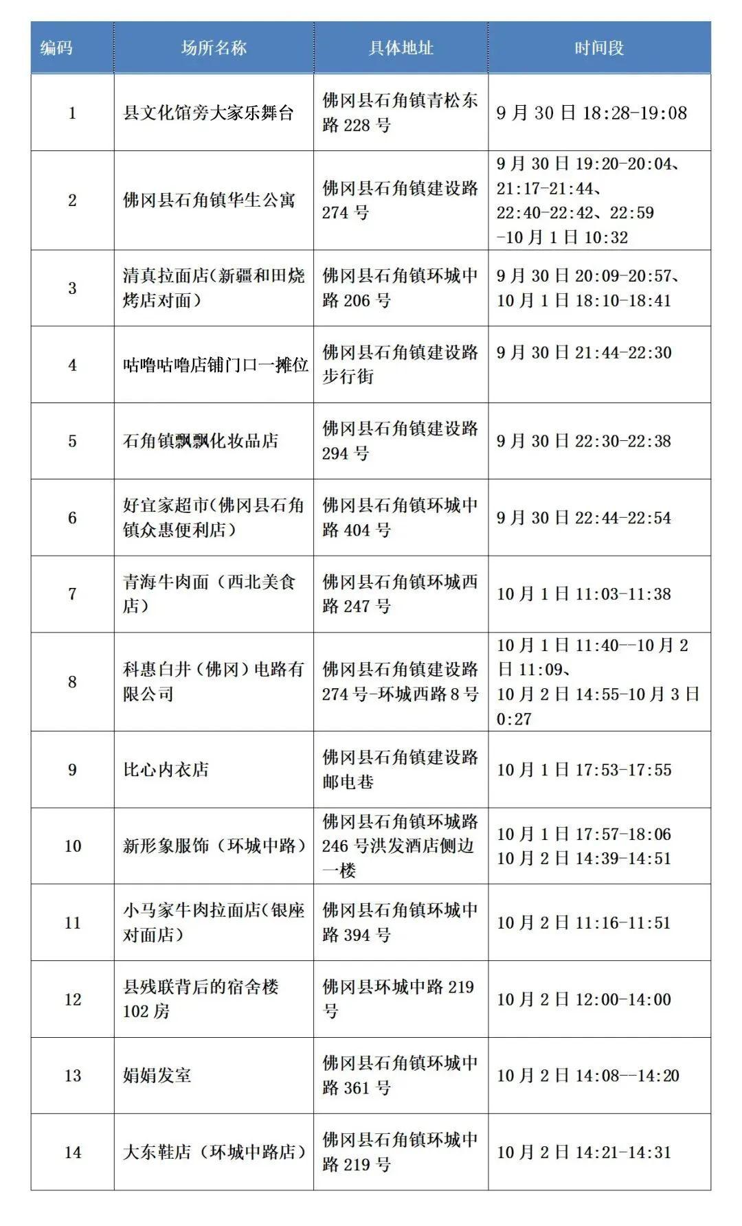 4、10月2日,清远市佛冈县石角镇排查发现一名外省来粤人员核酸检测异常。根据疫情防控需要,经佛冈县新冠肺炎疫情防控指挥部研究决定,自2022年10月3日起在石角镇(东至环城东路出口,南至106国道县城段,西至科惠电路有限公司,北至潖江河东岸)实施临时管控。