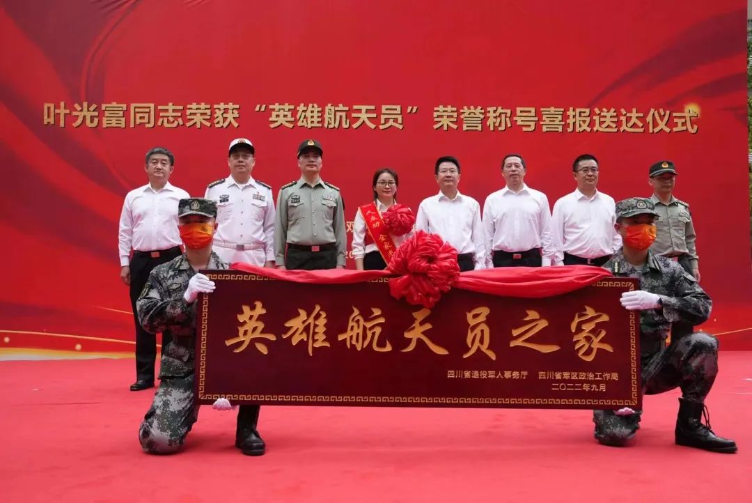 近日,省退役军人事务厅党组书记、厅长、省双拥办主任鞠波,省军区政治工作局主任曾建超等一行来到天府新区东林春天小区,将“英雄航天员”荣誉称号喜报和奖励通知书送到叶光富姐姐叶亚丹手中。