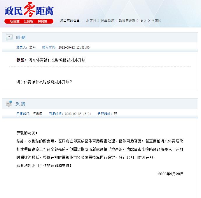 截至目前,河东体育场改扩建项目建设工作已全部完成。但因近期我市新冠疫情形势严峻,为配合市防控防疫政策要求,开放时间顺延,整体开放时间视我市疫情发展情况再行确定,预计10月份对外开放。