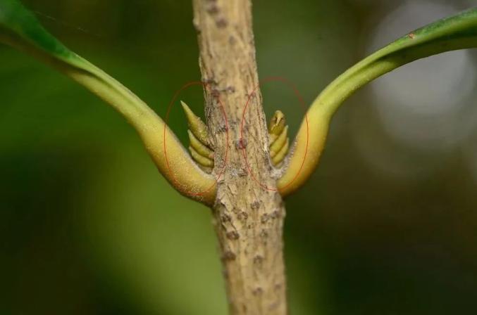 最后,桂花拥有叠生芽,其腋芽多为2-4个叠生,这也是4个特征中最关键的一个。