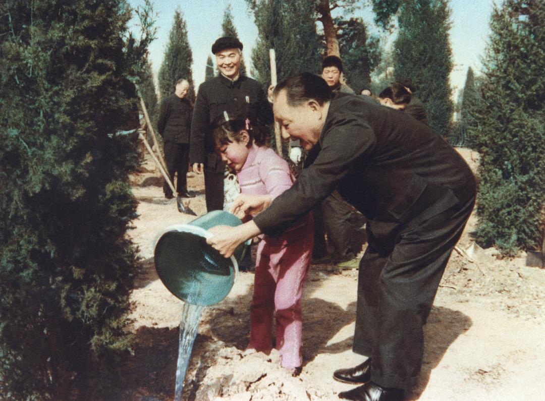 1987年4月5日,邓小平与外孙女在植树1987年4月5日上午,邓小平来到天坛公园,和家人一起挥锨栽下了这天义务植树的第一棵桧柏。劳动中,他手拉着身旁的外孙女羊羊,笑着对在场的人说:“今天我带的这个人,已经跟我种了六年树了。今天我又增加了一个部队,羊羊的小弟弟。”他还郑重地强调:“植树绿化要世世代代传下去。”