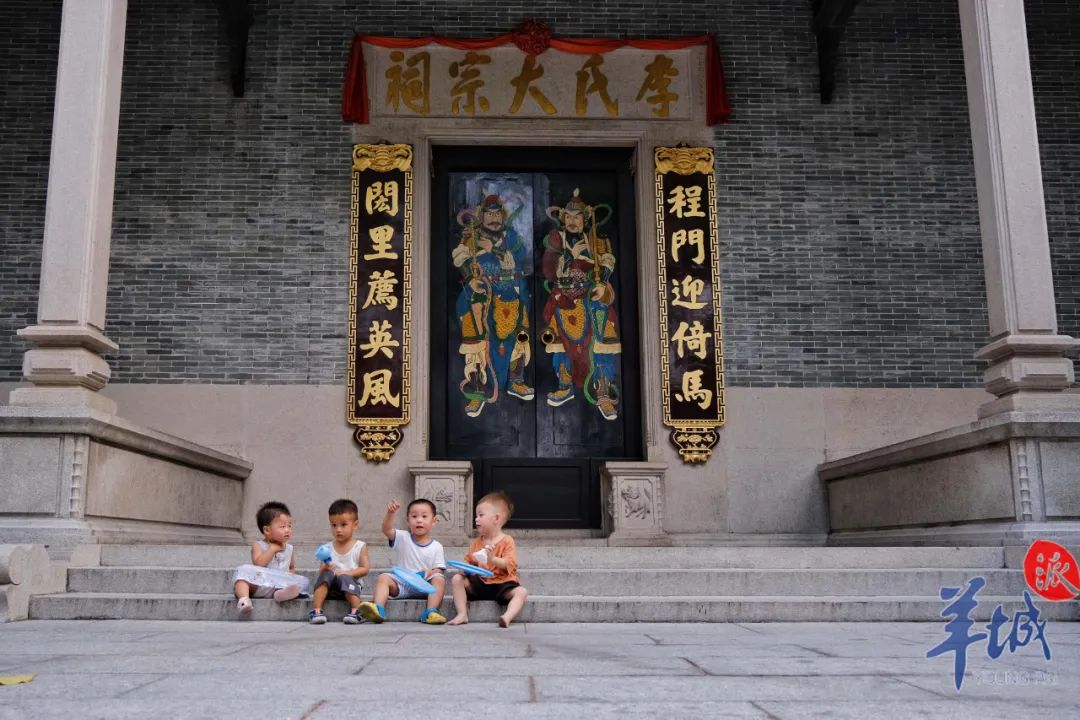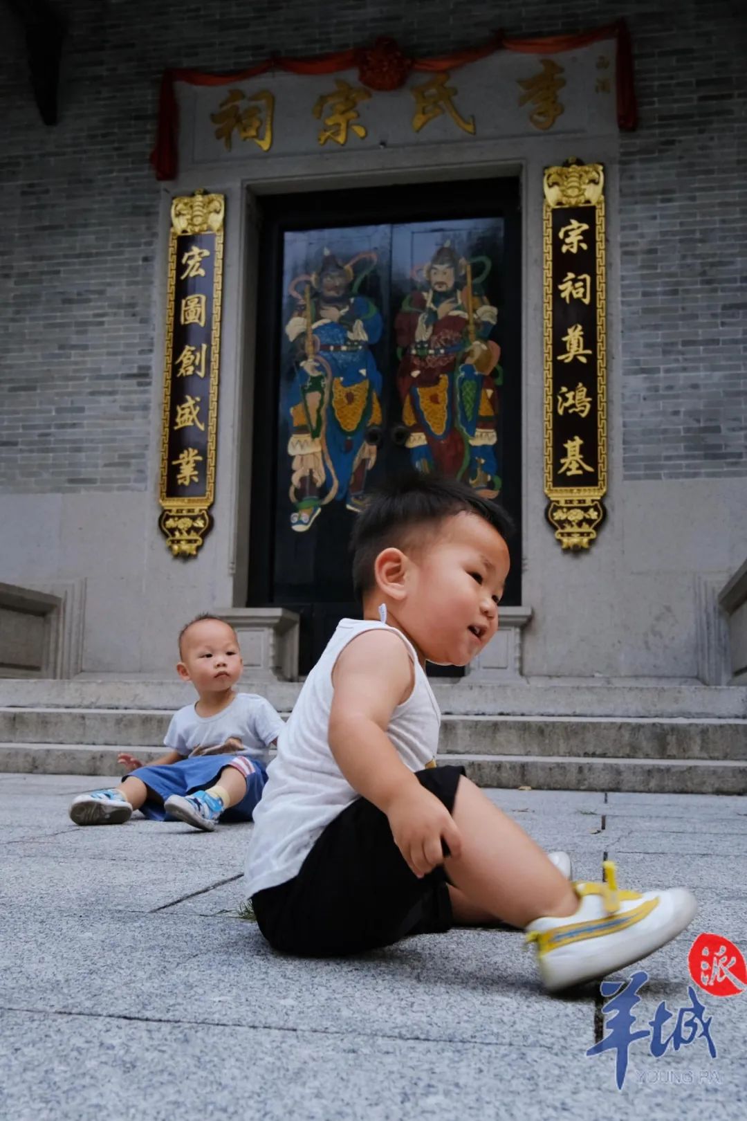 老人和小孩在祠堂附近闲聊、玩耍,充满闲适的生活气息