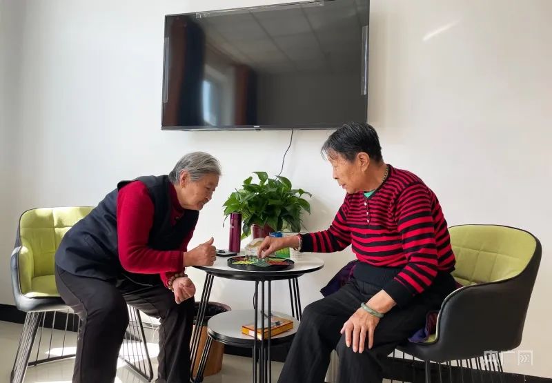 秦玉珍和何秀英在房间内下跳棋(央广网发 白梅薇 摄)82岁的何秀英老人说,她是自己逛公园的时候发现了这里,在楼上就能看到公园,环境又好又舒适,便主动向家人要求过来住,入住后晚上护理人员会打好洗脚水,不想去餐厅吃饭也有专人送到房间,比自己想象的还要好。