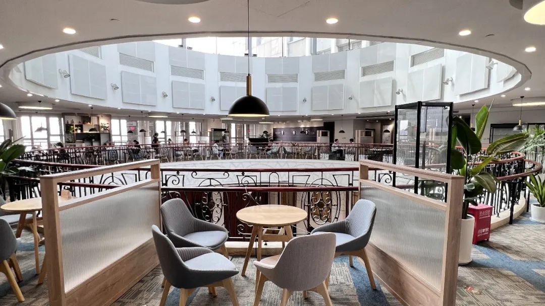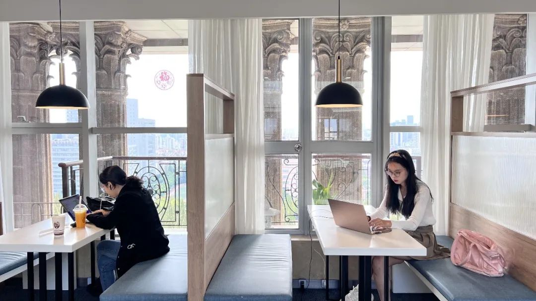 二楼南侧有配备多媒体交流桌和智能电视的独立包厢,还有为需要长时间交流的师生设置的静音仓。靠近落地窗的卡座、沙发区,让自习也变成了一件幸福的事。