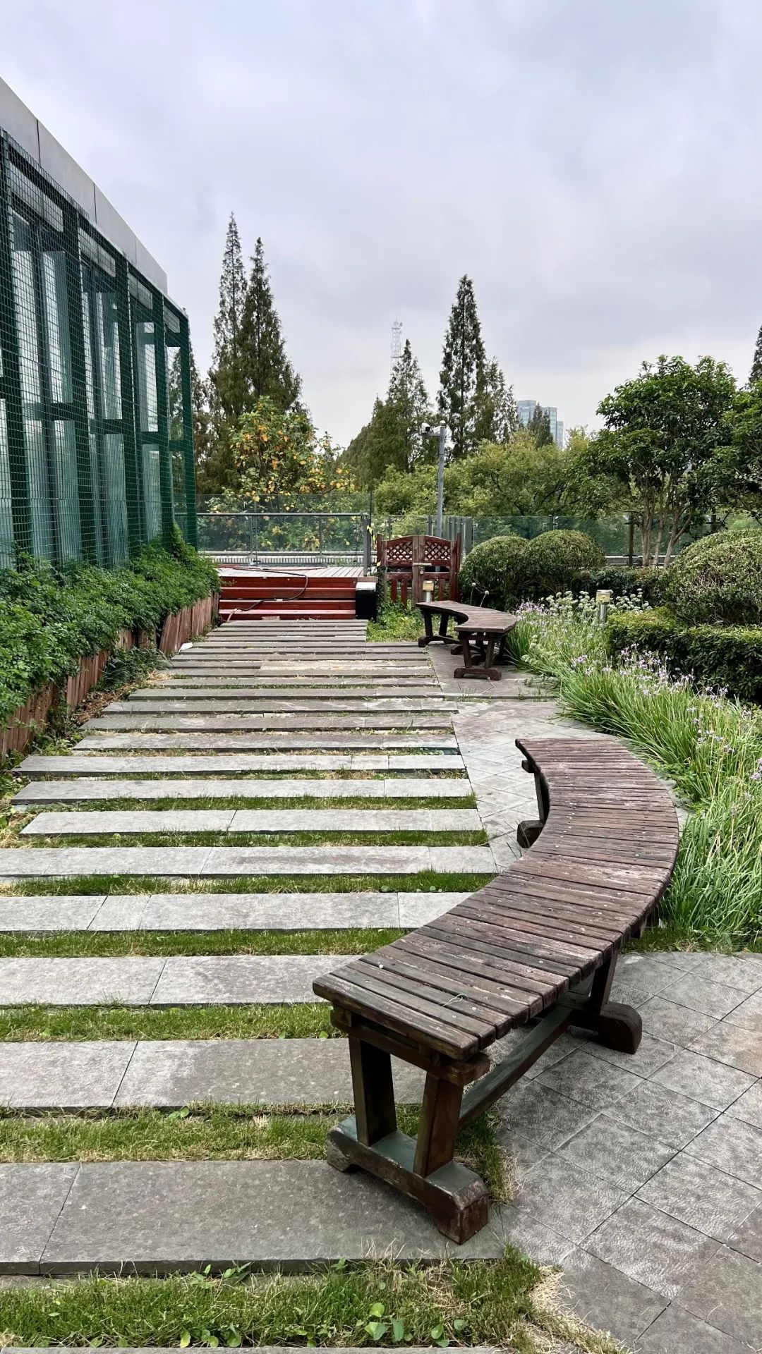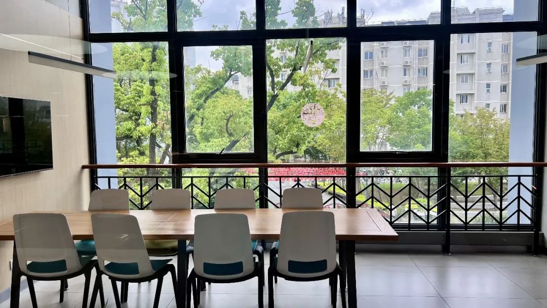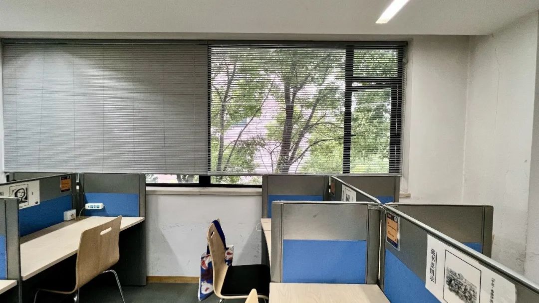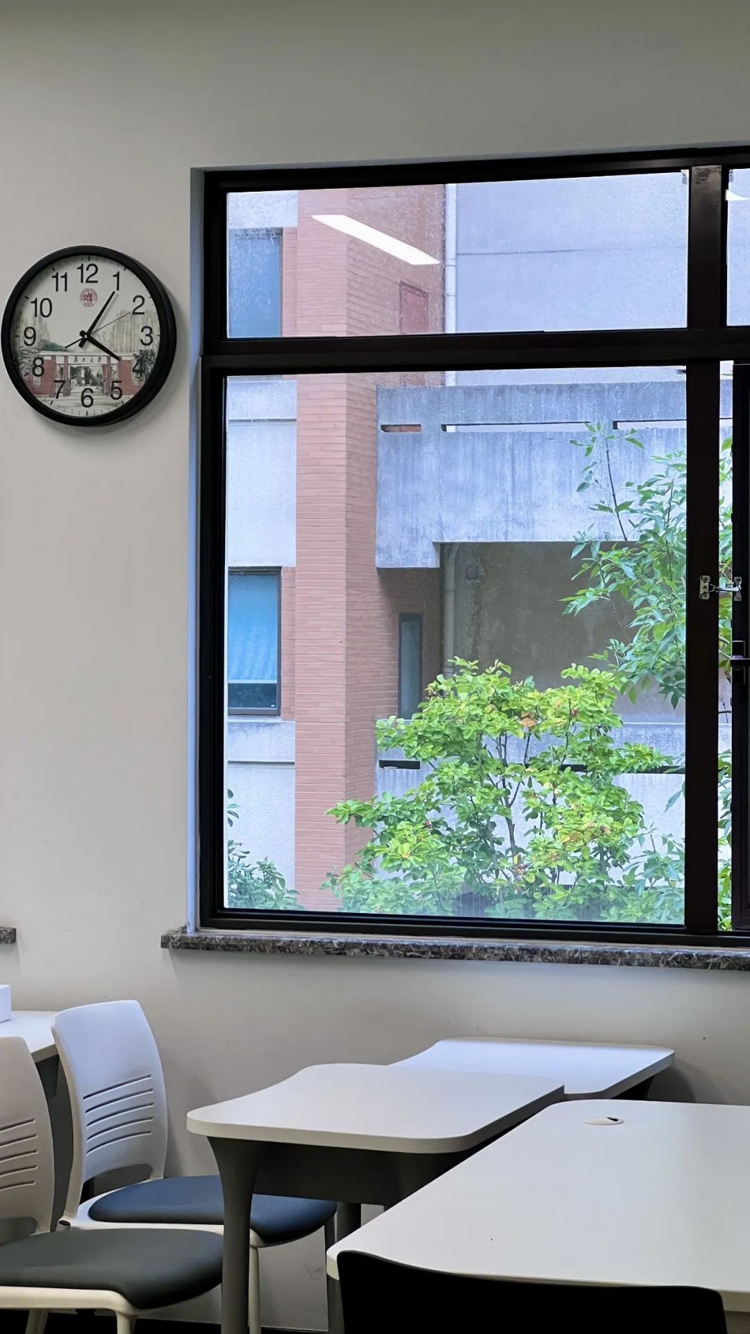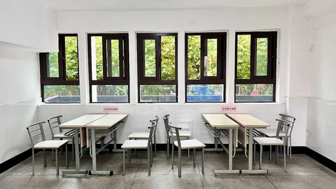 楼梯间的小道都设有桌椅,自习间隙望向教室窗外,满目的绿意令人神清气爽。