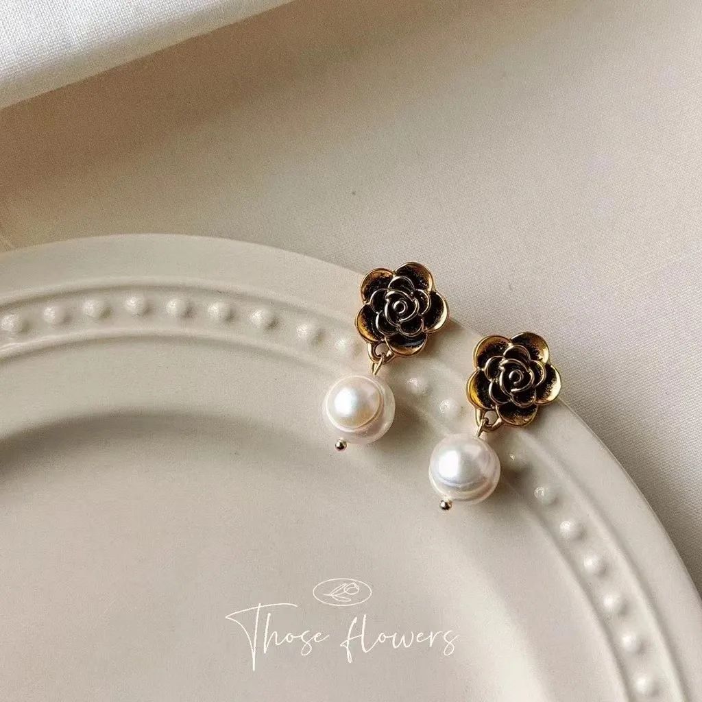 山茶花特意采用了做旧设计,金属质感显得更加厚重,秋天佩戴起来很能压得住。下面悬挂的是异形天然淡水珍珠,不规则的形状与众不同,是我很爱的感觉。
