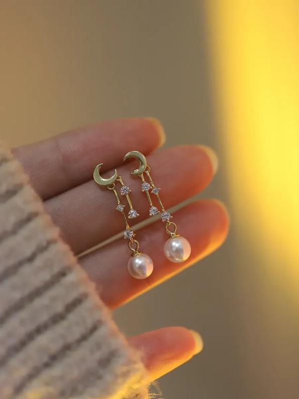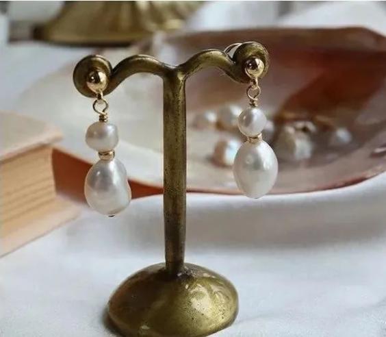 这对耳坠整体高度约为3厘米,选用天然异形白色珍珠,耳针为S925银,余下材质均为铜镀金。13 | 珍珠少女