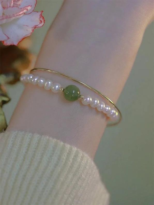 这副手链就有点新中式设计的味道了,绿色玉石和珍珠的结合,就给人一种复古优雅的感觉。带有盘扣或者立领之类的小上衣,再配上这款手链,效果应该会相当不错~