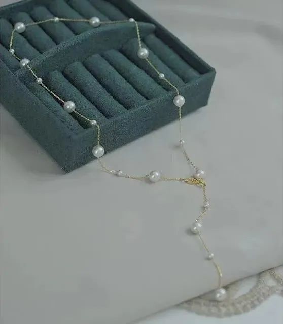而项链中的珍珠大小不一,依次排列,让整条项链极具美感。同时,珍珠的流苏能拉长颈部线条,让脖颈看起来更加修长好看,凸显优雅的气质。
