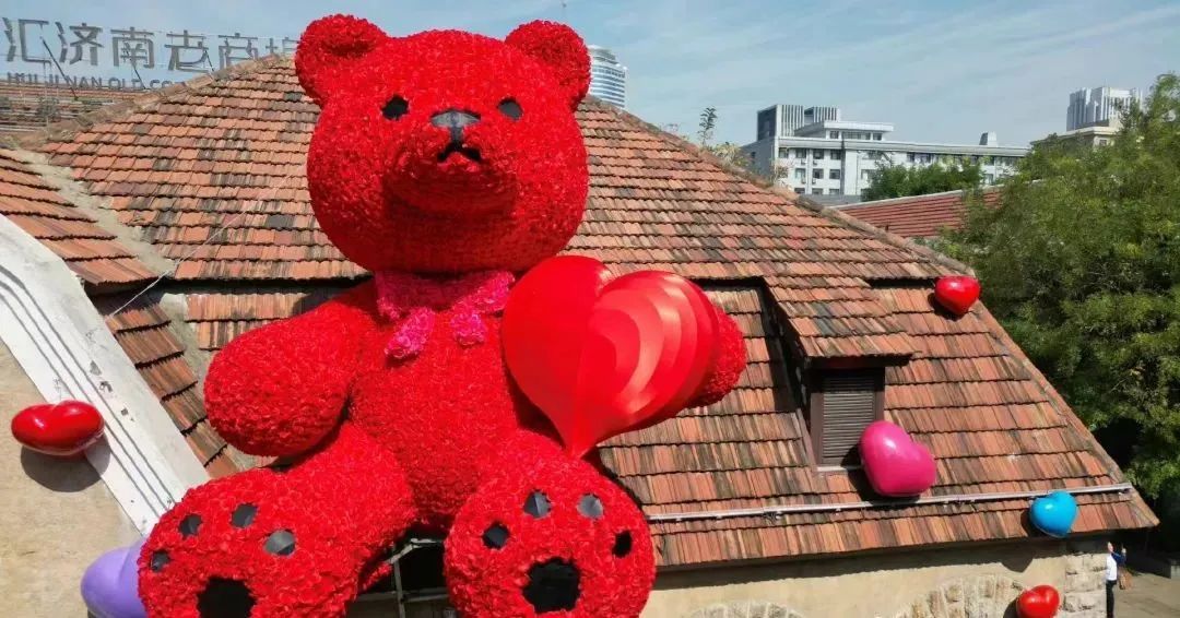 除了之前爆火的草莓熊、折耳兔、夹心胡同,老商埠又上新了巨大的“玫瑰熊”,再一次把浪漫玩出了新境界。